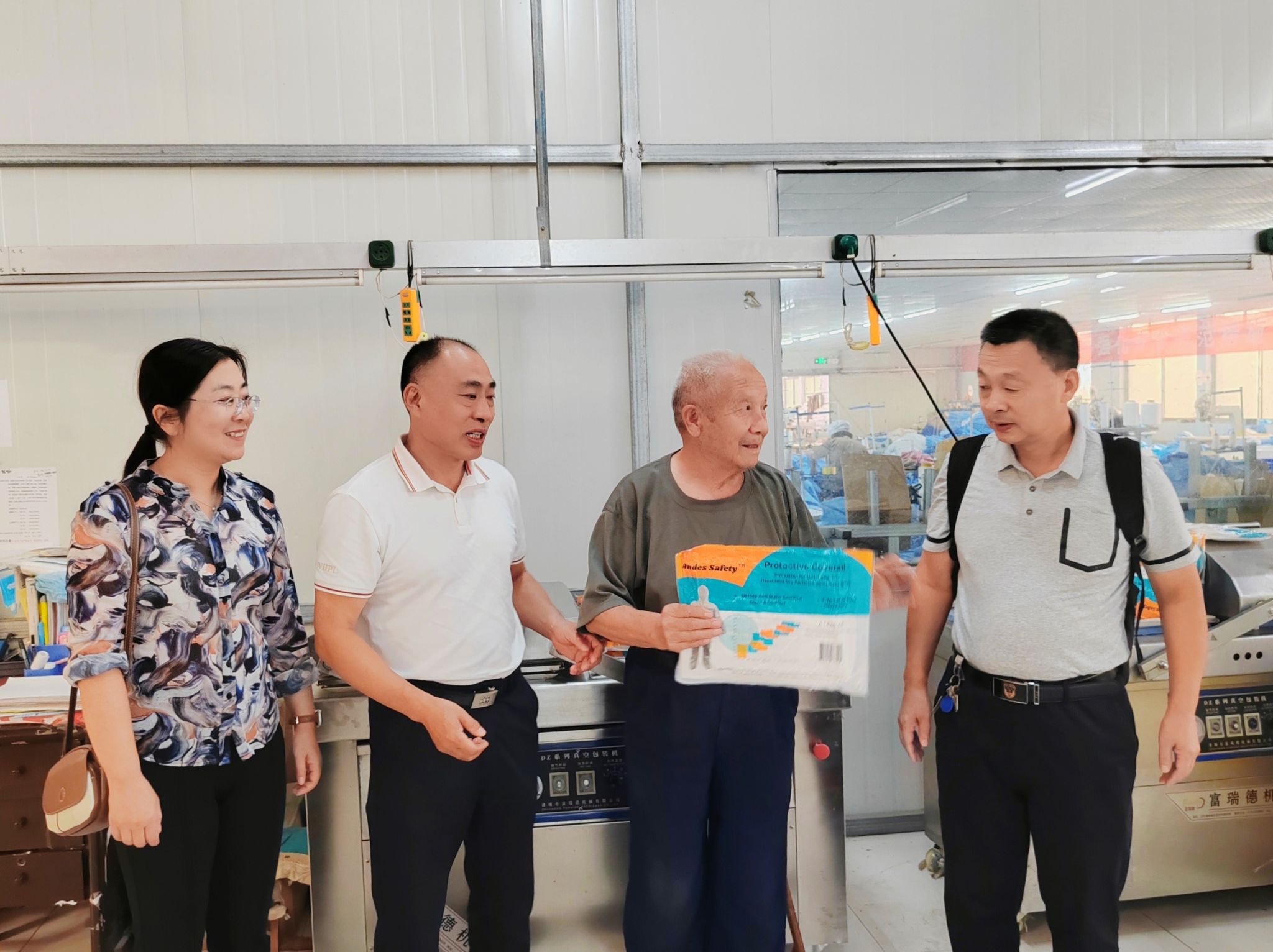 在山东莒县90岁高龄的离休老干部杨书范的家中,杨老热情接待了王祥义一行并亲切攀谈。大家了解到,在当时担任村农会主席的父亲和中共地下交通员的大哥引领下,年仅13岁的杨书范就应征入伍,先后担任部队的卫生员、护士长、军医、教导员、149医院副政委,戎马一生,历经苦难,从军四十载初心不改。1990年离休后,他带领渔民搞渔业养殖,2015年,年已古稀的他回到家乡莒县夏庄村,先后创办了莒县威德曼家纺用品厂、菲莉医疗器械厂,带领村民开启乡村振兴之路。疫情期间,杨书范与工人们不眠不休,奋战赶制数千套防护服等防疫用品,无偿服务父老乡亲并支援武汉。还创办了长岭镇书森希望小学,帮助贫苦家庭的儿童上学。他用实际行动,表达了老兵的爱国情怀,一辈子初心不改为人民。曾被中央军委授予“胜利勋章”,获得全国总工会“双爱双评”活动优秀职工之友、日照市道德模范等多项荣誉。