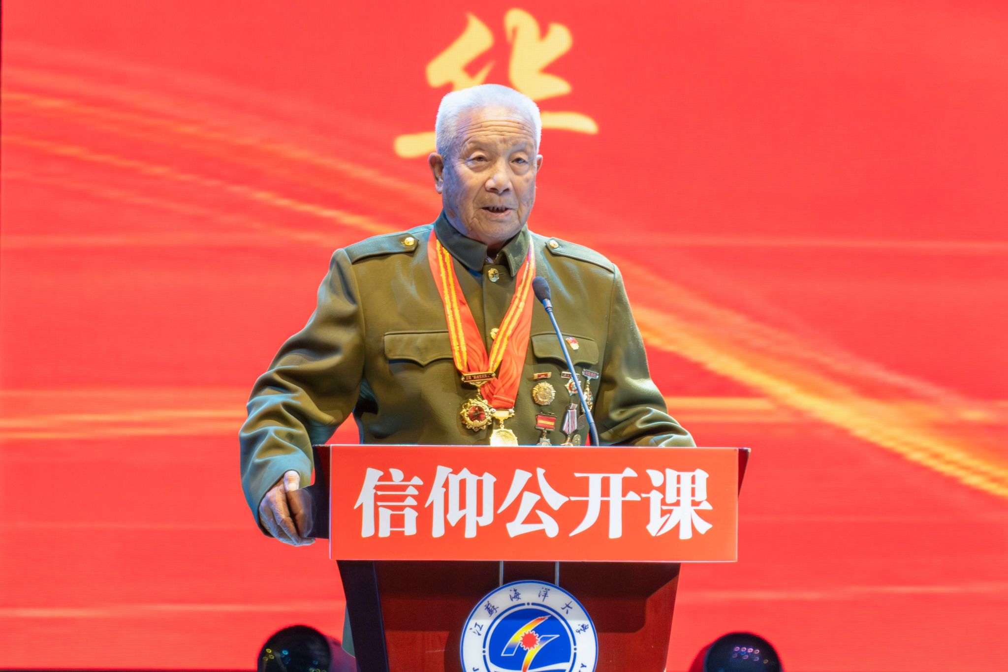 现年90岁的老兵杨书范以《生命不止,革命不休》为题,讲述了13岁应征入伍42年从军报国的革命故事和离休后带领乡亲创业致富的感人经历。解放战争时期杨书范在部队担任卫生员,新中国成立后在一四九医院先后担任护士、护士长、教导员、政治处主任、副政委,曾被授予“胜利功勋荣誉章”。他动情的说“党和部队培养了我,也给予了我很高的荣誉,我尊敬党、感激党,我要继续为党、为人民做实事,为国家创造财富。”离休后没有就此安逸享乐,坚持活到老、干到老。他带领渔民搞水产养殖10余年,80岁后回到家乡山东莒县农村,创办菲利医疗器械有限公司至今,带领乡亲致富,捐建书森希望小学,疫情期间制作了数千套抗疫物资无偿驰援武汉,用实际行动坚守着一名老兵的初心和担当。他希望同学们好好学习,报效祖国,为实现强国梦想一起做出贡献。