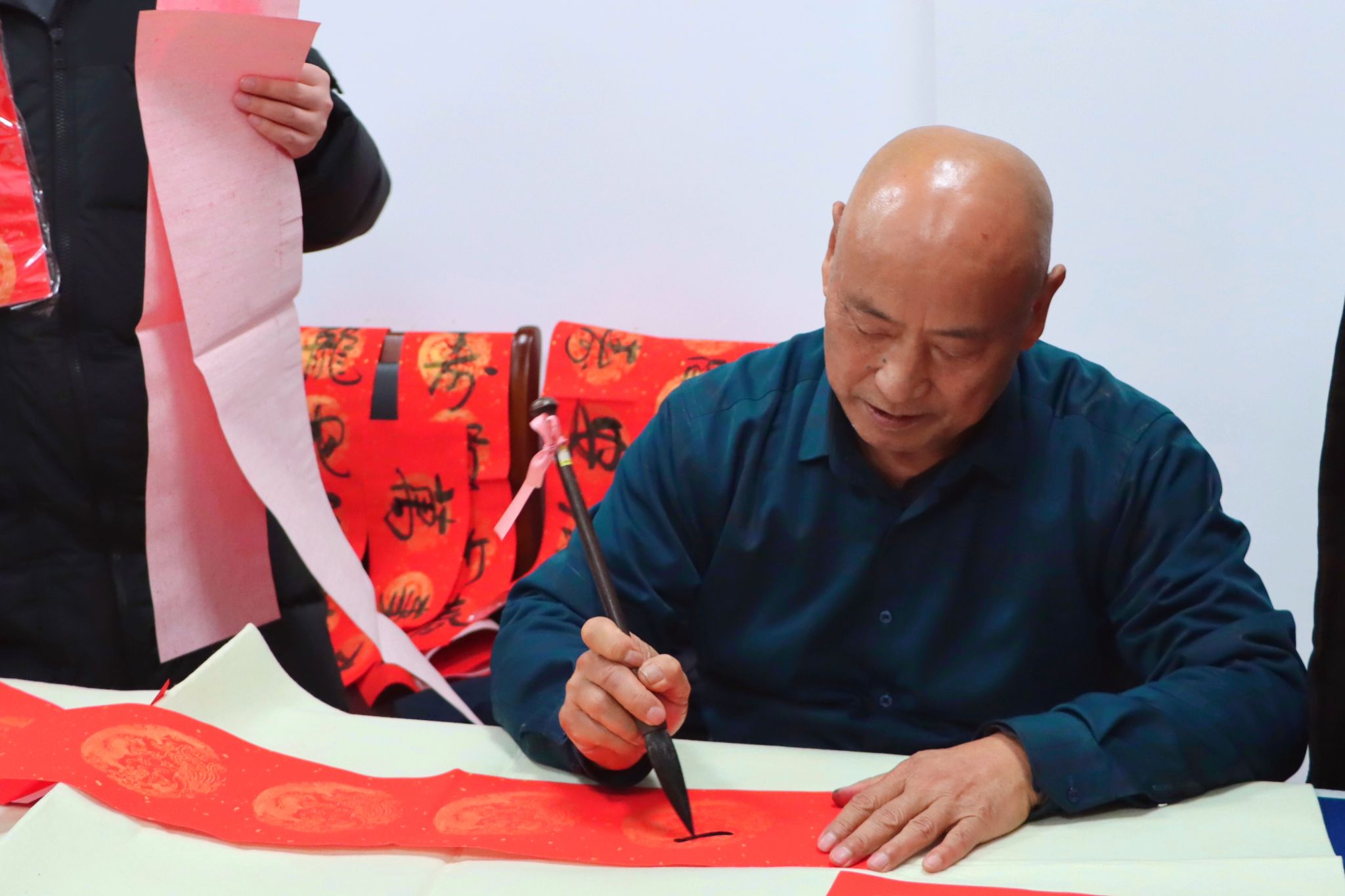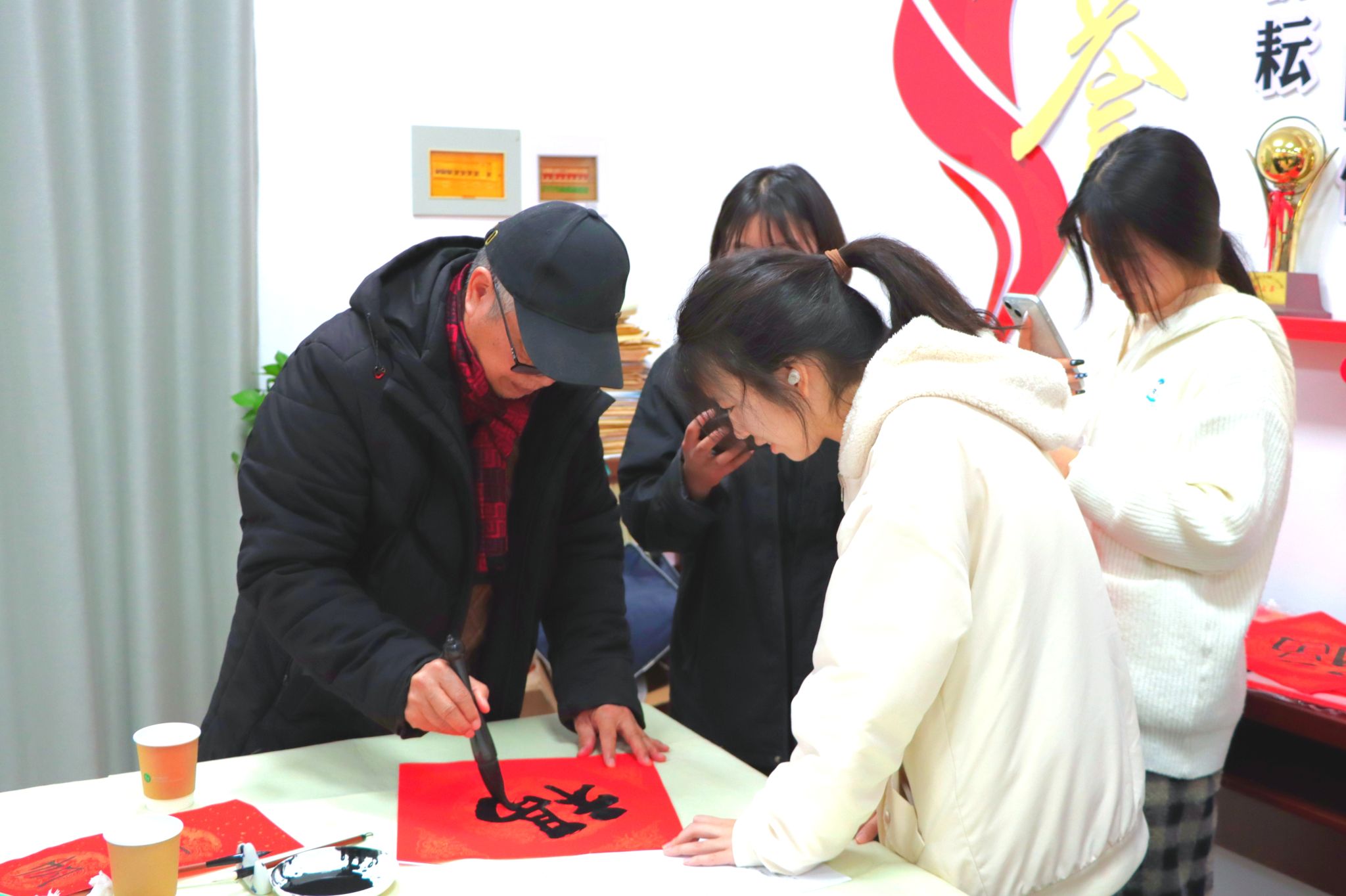 1月3日下午,校离退休工作处、关工委、工会和团委在筑海楼一楼联合举行“送福迎春”师生写春联活动。离退休老教师董立业、丁耀进、于建春、吴琼以及校团委副书记王衍、商学院辅导员曹轶文等10余位师生志愿者来到现场,义务为全校师生写春联、送“福”字,共同迎接2025年新春佳节的到来。