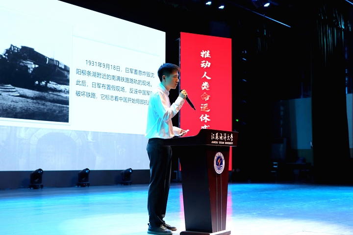 商学院团委书记谭鑫深入讲述了《义勇军进行曲》的创作历史背景,再现了聂耳、朱启杰等抗战英雄的感人故事和刘老庄连的英勇事迹;应用技术学院团委书记陈姝含与同学们共同讲述了“青口十八勇士”的英雄壮举;马克思主义学院青年教师罗睿从反法西斯战争的“东方序幕”“东方支柱”“国际基石”三个方面,讲述了《东方主战场——中国抗日战争为世界反法西斯战争胜利作出重大贡献》主题思政课。