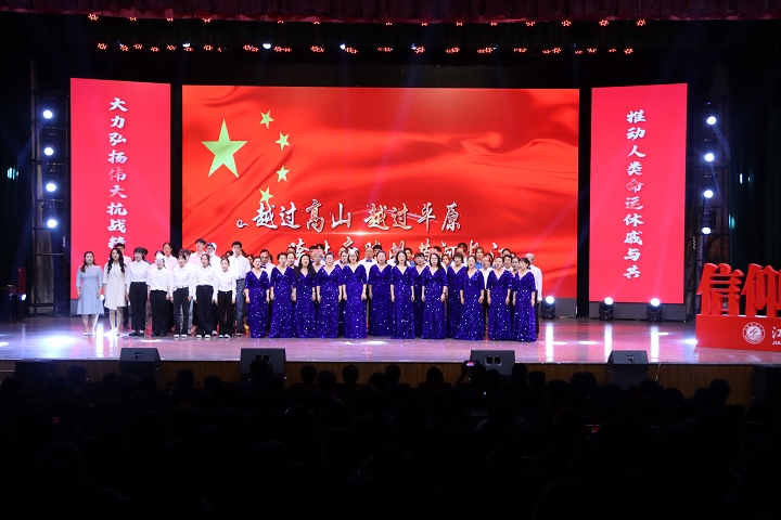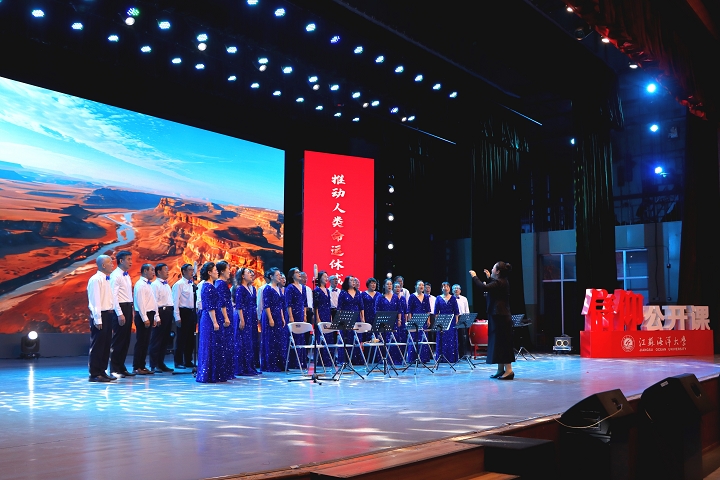 大学生艺术团合唱队唱响《保卫黄河》,器乐队用中西乐器合奏《万疆》。本次音乐思政课在全体师生同声唱响《歌唱祖国》声中落下帷幕。参加活动的师生表示:这是一堂生动的爱国主义教育大课,形式新颖,内容感人。新时代,新征程,民族复兴的接力棒交到我们手上,我们应当铭记历史,撸起袖子加油干,奋力谱写中国式现代化建设挺膺担当的新篇章。
