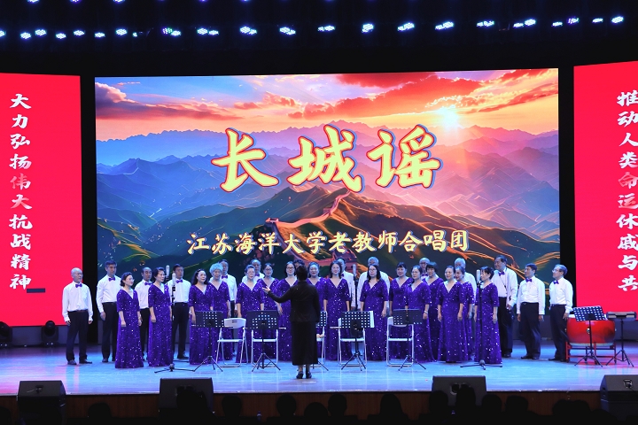 老教师艺术团合唱队和器乐队的35名老同志与青年师生同台演绎。一首《长城谣》合唱,用叙事与抒情方式,表达出在民族存亡的危急时刻,中国人民同仇敌忾、保家卫国的革命意志和必胜信心;在铿锵有力的器乐伴奏下,老教师们精神饱满合唱《军民大生产》,演绎了在物资匮乏的抗战岁月里解放区军民团结一致,用锄头和纺车改写命运,把荒山变成良田,把窑洞变成希望家园的劳动交响曲。