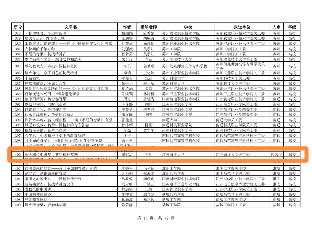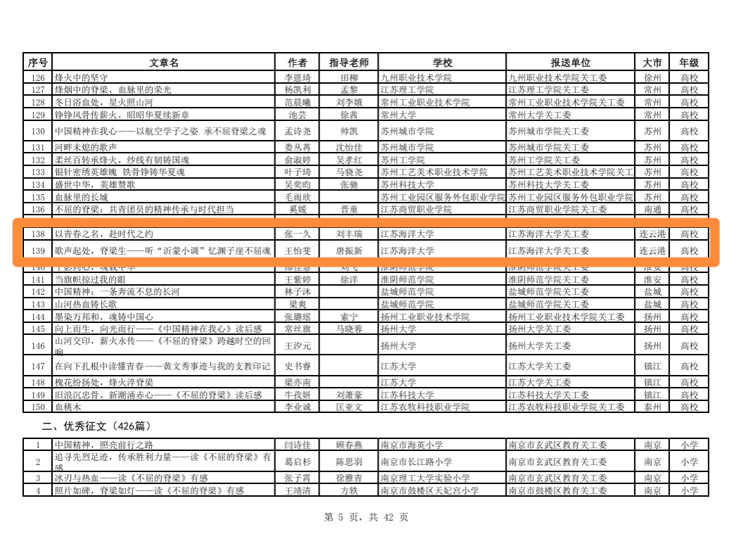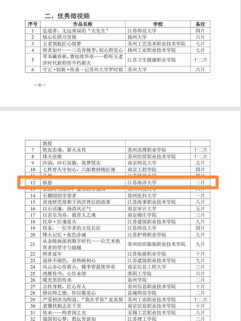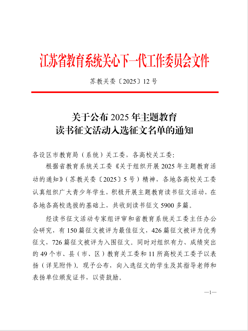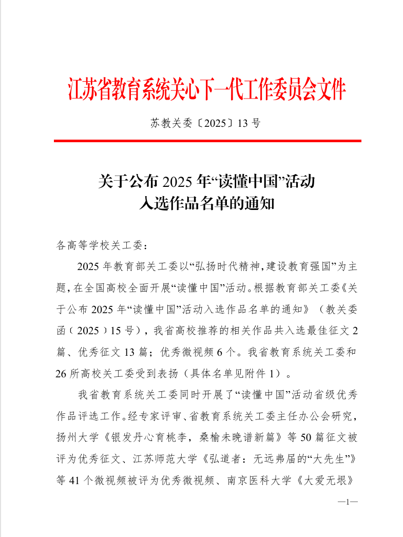 近日,江苏省教育系统关工委发布《关于公布2025年“读懂中国”活动入选作品名单的通知》(苏教关委〔2025〕13号)和《关于公布2025年主题教育读书征文活动入选征文名单的通知》(苏教关委〔2025〕12号),我校关工委选送的《报恩》获评“读懂中国”活动江苏省优秀微视频。海洋科学与水产学院唐振新指导海科1241班王怡斐撰写的《歌声起处,脊梁生——听“沂蒙小调”忆渊子崖不屈魂》和理学院刘丰瑞指导光信1232班张一久撰写的《以青春之名,赴时代之约》获评主题教育读书征文活动“最佳征文奖”;外国语学院王熙指导领航英语1233班张雅甜撰写的《薪火相传中国梦,共绘精神蓝图》获评“优秀征文奖”。