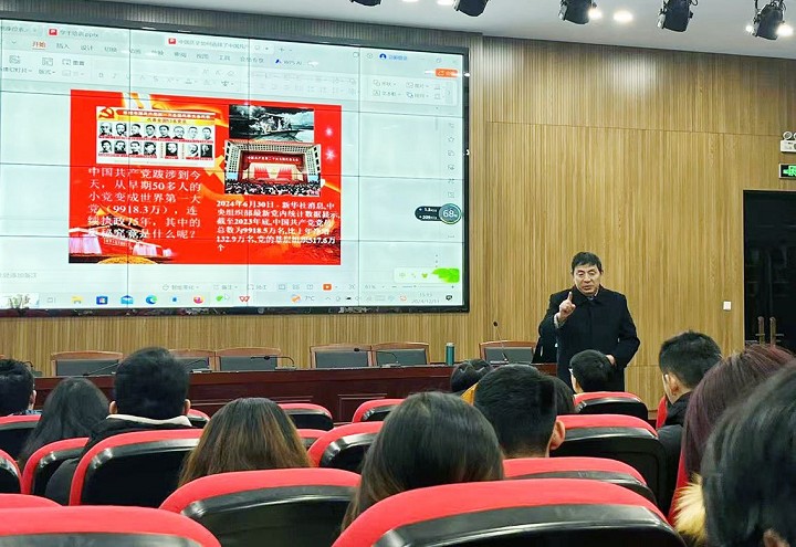 头发花白却精神矍铄的历史学副教授张明祖以“中国历史为什么选择中国共产党”为题,从“以史为鉴,追溯历史脉络中的必然抉择”“使命担当,中国共产党的先进性与独特优势”“人民至上,赢得民心铸就历史伟业”“展望未来,传承红色基因砥砺奋进新征程”四个方面解读中国共产党是历史和人民的必然选择。整堂思政课内容丰富,既有深刻的历史分析,又有鲜活的现实案例。既有理论的高度,又有实践的深度。不仅让同学们对中国历史选择中国共产党的内在逻辑有了更为清晰的认识和理解,更激发了同学们的爱党爱国情怀和为实现中华民族伟大复兴而努力奋斗的决心与信心。