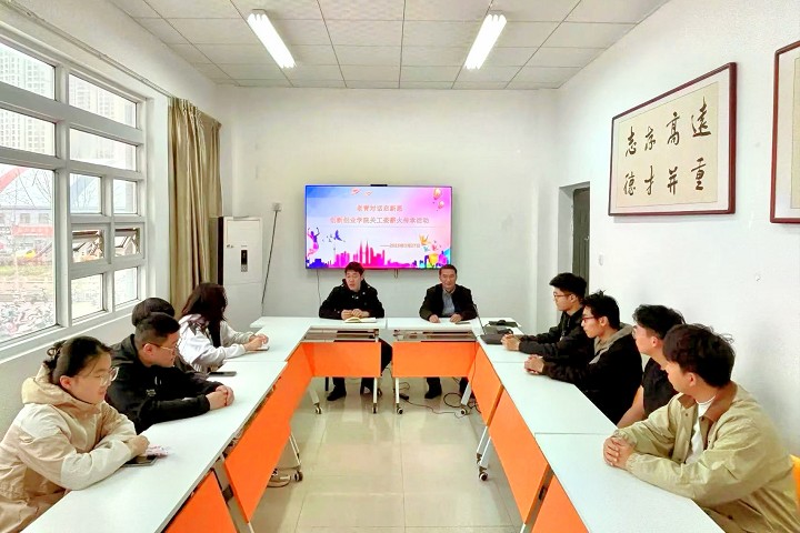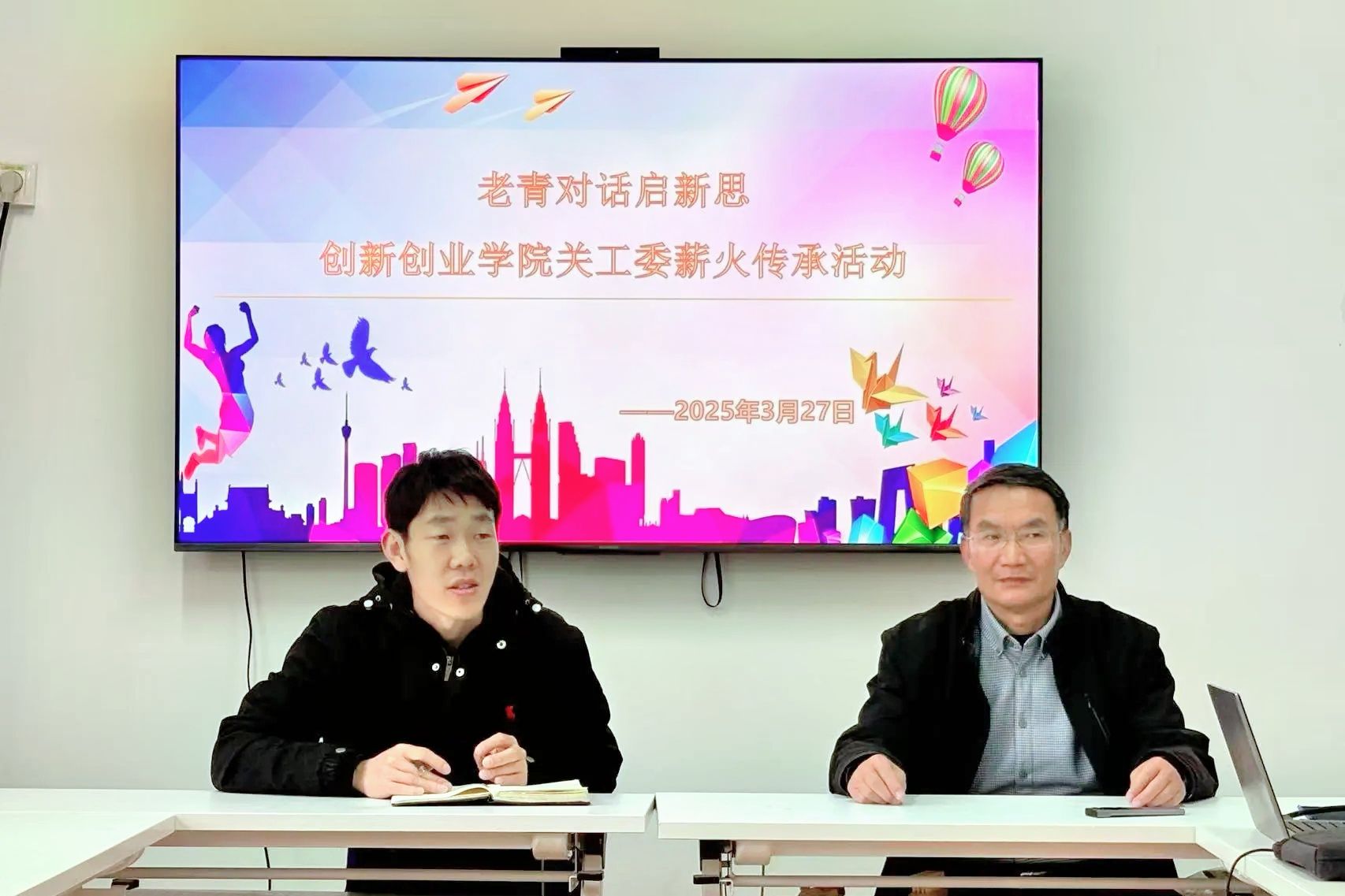 3月27日下午,创新创业学院在“一站式”学生社区D5/D6-206室举办“老青对话启新思”薪火传承活动,学院关工委常务副主任韩服善、辅导员孙士生和领航1231班学生代表参加活动。