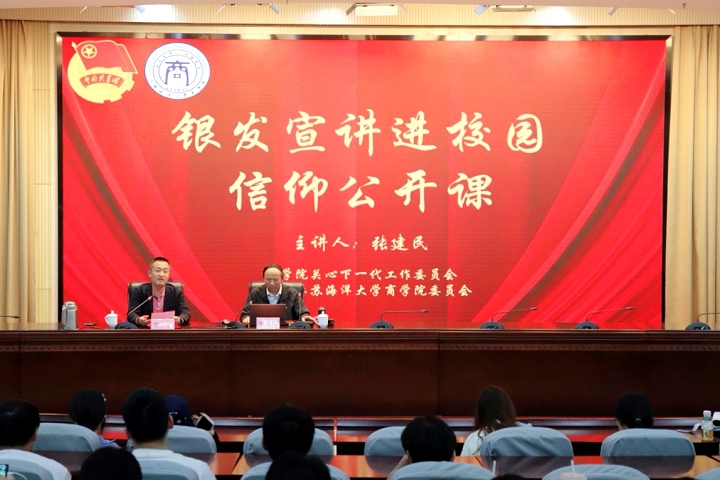 为培育社会主义核心价值观,引领青年学子筑牢信仰之基,4月16日下午,商学院关工委在会议中心黄海厅举办“银发宣讲进校园”信仰公开课,市离退休干部“银发生辉”先锋宣讲团副团长、市社科联原主席张建民受邀主讲。商学院院长孙军主持公开课,并为张建民颁发了“校外辅导员”聘书。