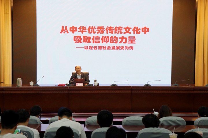张建民以“深入贯彻中央八项规定精神学习教育与信仰塑造的内在联系”为切入点开启授课内容。课程聚焦连云港社会发展历史,通过“中华优秀传统文化与连云港的历史渊源”独特视角,引导师生探究连云港的发展历程和所取得的卓越成就。他援引精卫填海、愚公移山等神话传说,展现中华民族坚韧不拔的意志品质与精神信念。他深入解读桃花涧将军崖岩画中所蕴含的“天人合一”哲学思想,以及苏马湾汉代界域石碑所承载的文明演变进程,彰显连云港深厚的文化积淀。他围绕徐福东渡开辟海上丝绸之路的壮举、孔望山摩崖石刻所体现的文化包容特质,以及秦东门所承载的重要历史意义等内容,对连云港的历史文化进行了深入剖析。他还讲述了沈云沛实业救国、江上青烈士的英勇事迹、小沙东海战烈士的革命精神。