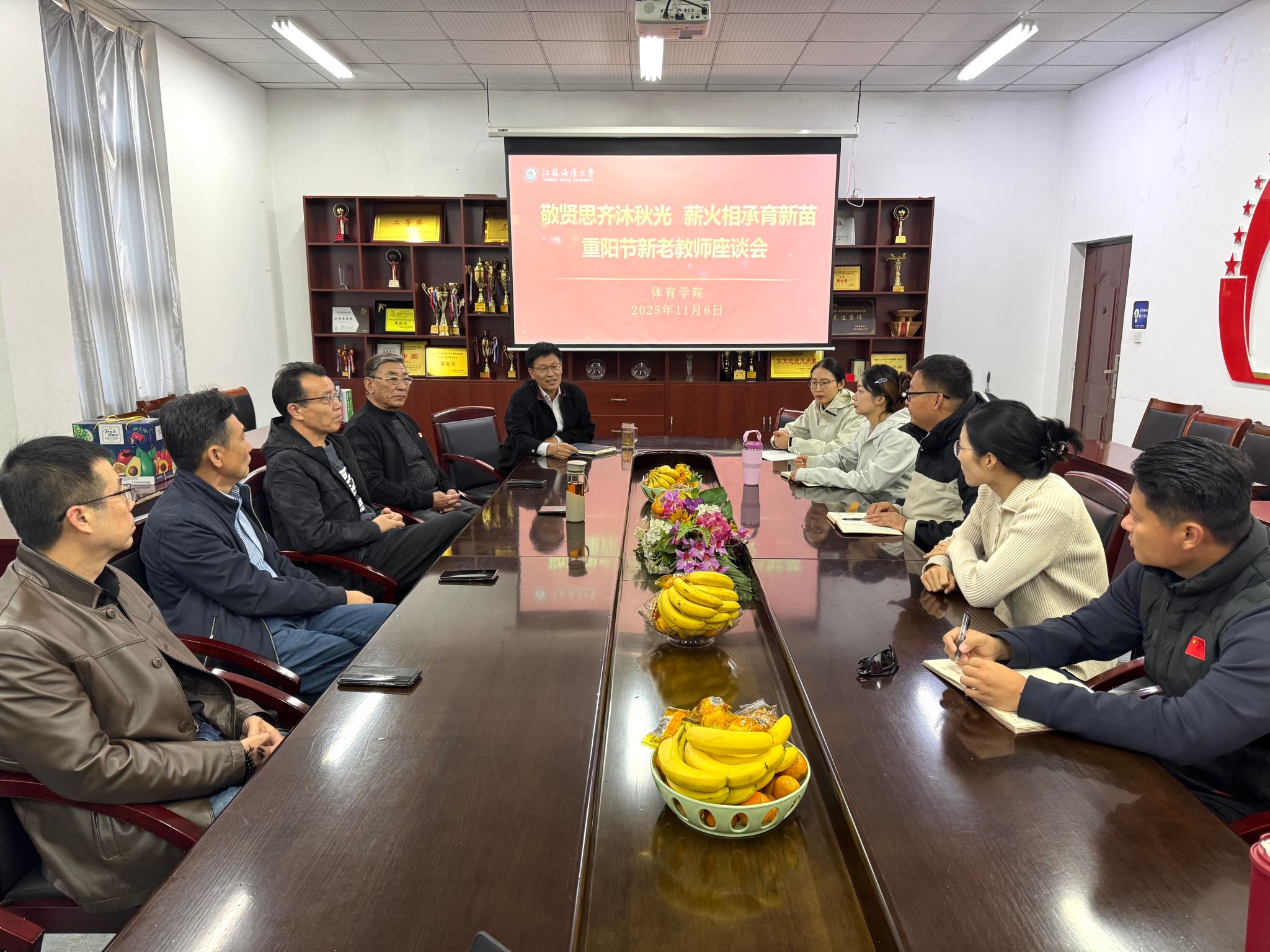 11月6日上午,体育学院关工委在学院会议室举办“敬贤思齐沐秋光薪火相承育新苗”新老教师座谈会。学院领导班子成员以及院关工委常务副主任孙盛杰,关工委委员周庆功、赵宏、贾洪全和新入职青年教师代表参加座谈。