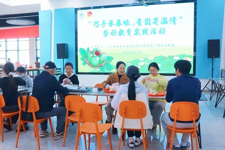 活动现场,食堂提前备齐青团皮、豆沙等馅料及工具。师生们分组有序参与,在老教师和食堂工作人员的指导下,洗净手、挽起衣袖,依次完成揉皮、包馅、压模成型等工序。大家一边动手实操,一边听老师们讲述青团关联的清明寒食传统与江南民俗。